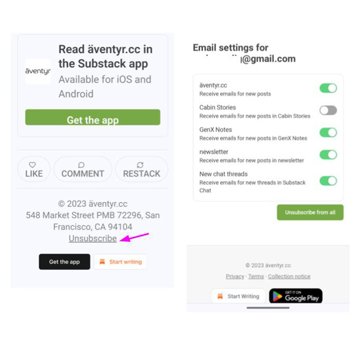Click ‘unsubscribe’ at the bottom of the email, which will take you to a subscription option screen showing the sections of our website (i.e. ‘Cabin Stories’, ‘GenX’, ‘Newsletter’).